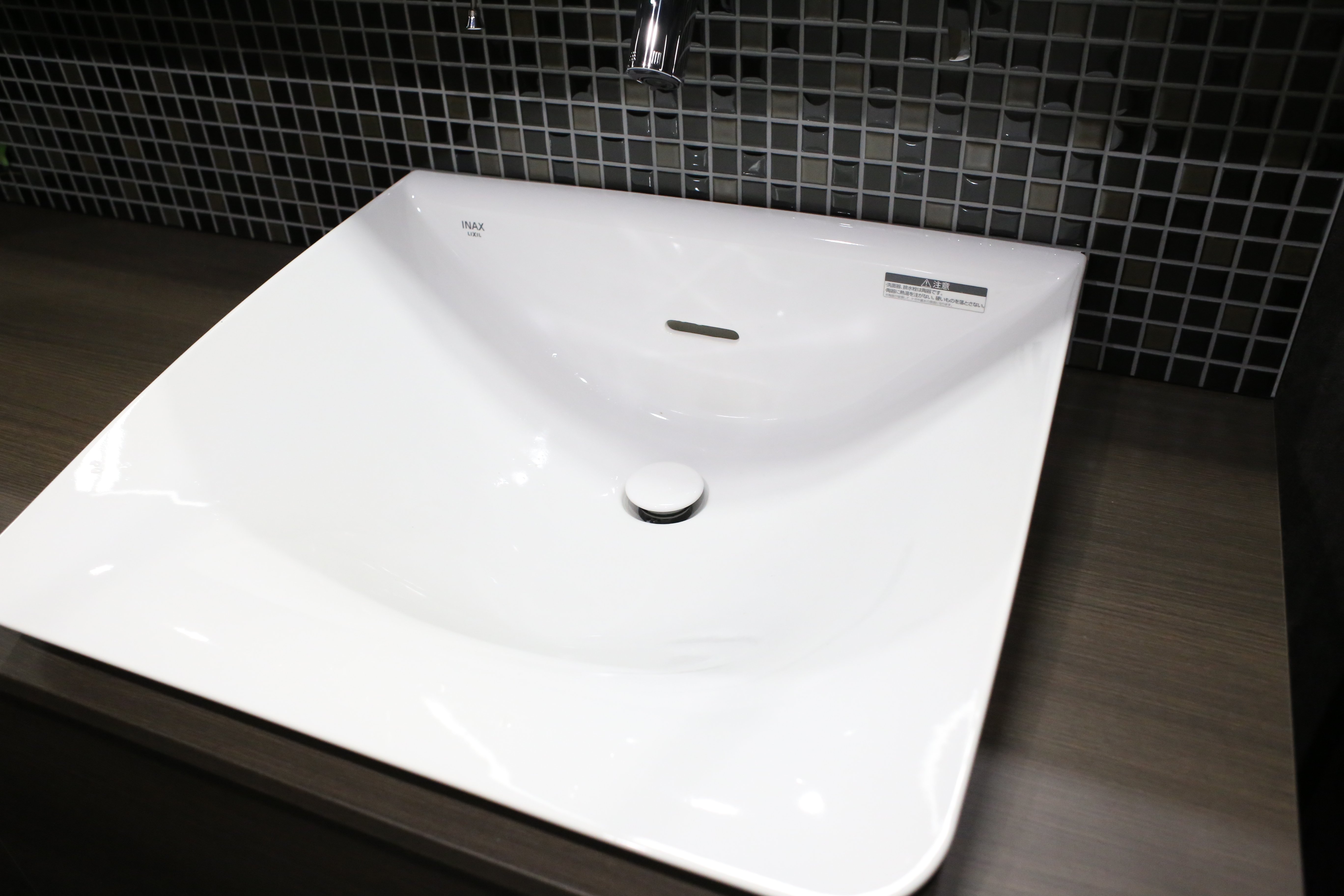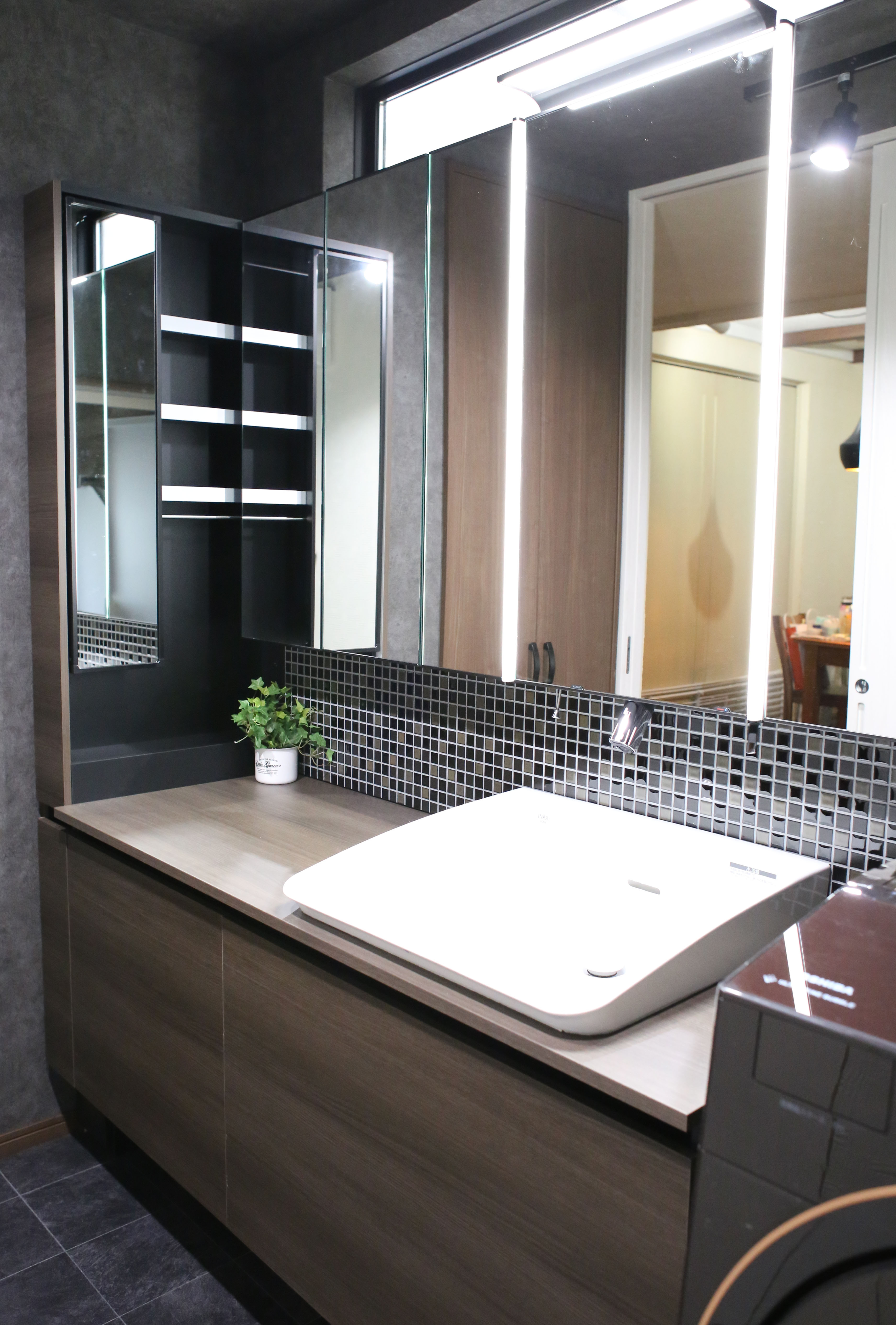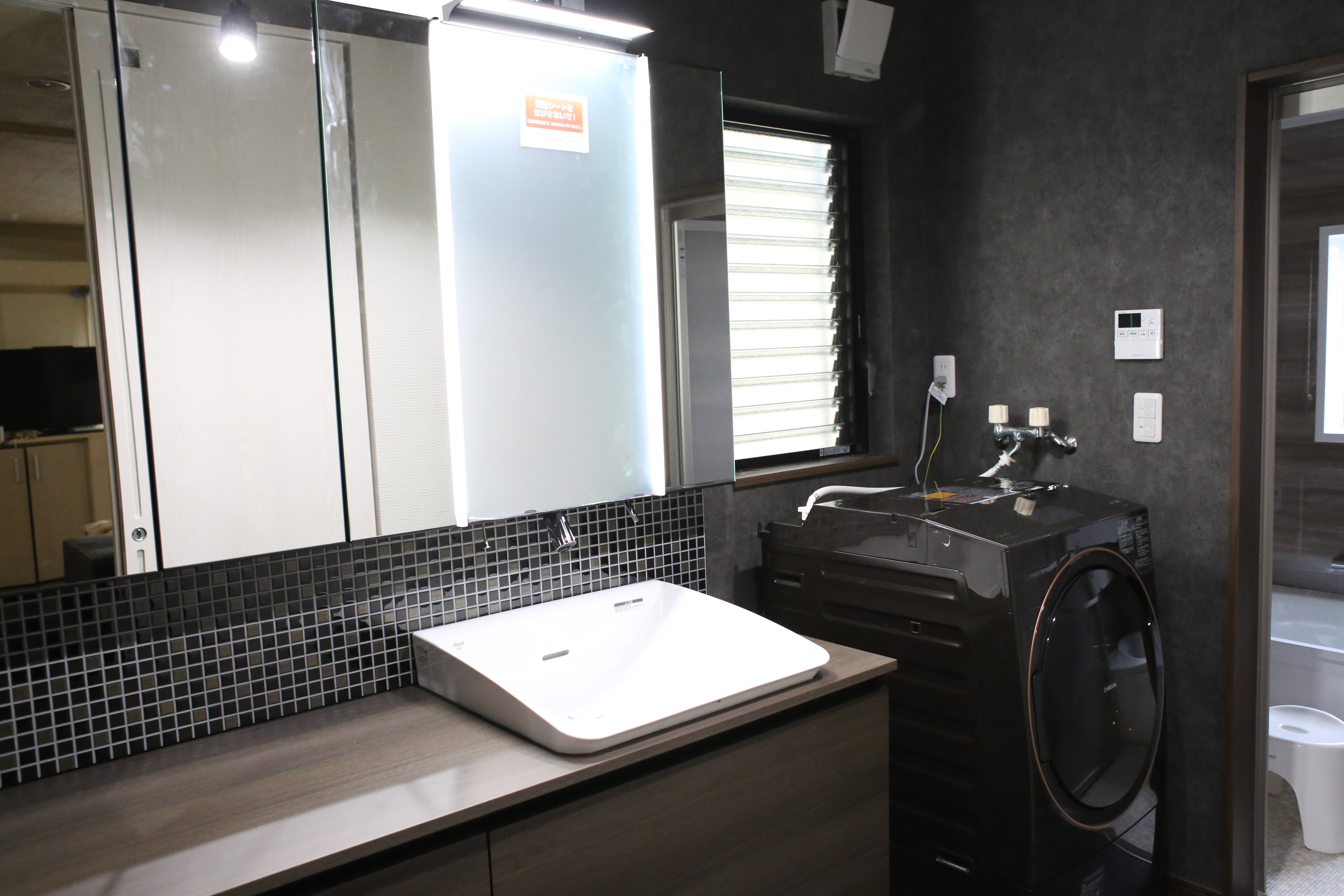 洗面空間には、LIXIL ルミシスのハイバックベッセルタイプを採用。 壁面にはLIXILのガラスタイルをあしらい、上質な質感を演出しました。 全体のカラーはブラックとグレーで統一し、落ち着きのある洗練された印象に。 素材と色の組み合わせにこだわることで、 ホテルライクでラグジュアリーな洗面空間が完成しました。
